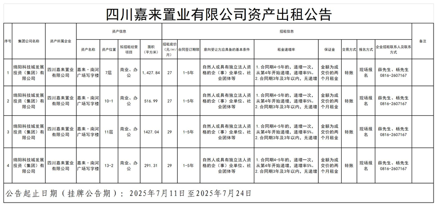 四川嘉來(lái)置業(yè)有限公司資產(chǎn)出租公告