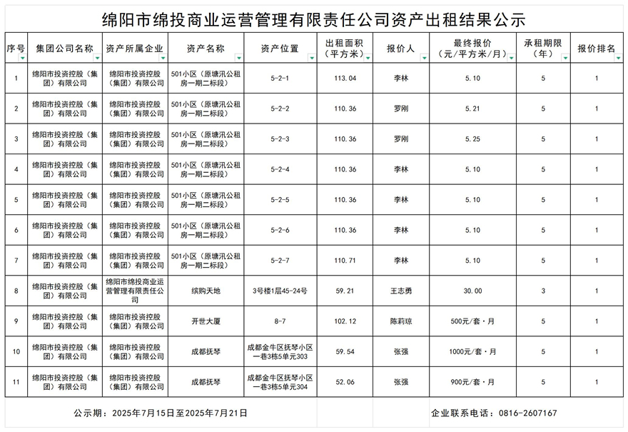 綿陽市綿投商業(yè)運(yùn)營管理有限責(zé)任公司資產(chǎn)出租結(jié)果公示